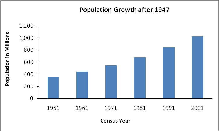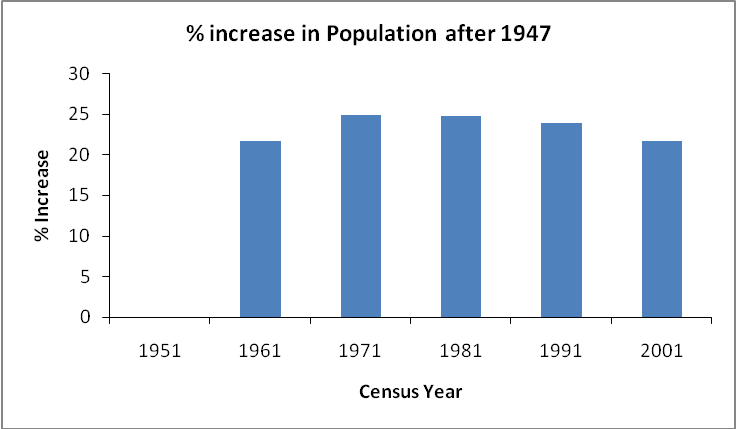 population growth after independence in 1947.Keep in mind this does not include more than 33% of pre 1947 India. After 1947, Pakistan (Bangladesh and the present day rump remaining of West Pakistan), Burma etc were separated from India. But even in the remaining Indian landmass the population has grown by over 500 million from 1961-2001!! From a simple glance at figures 6 and 8, it looks like some kind of a negative force has been taken off a