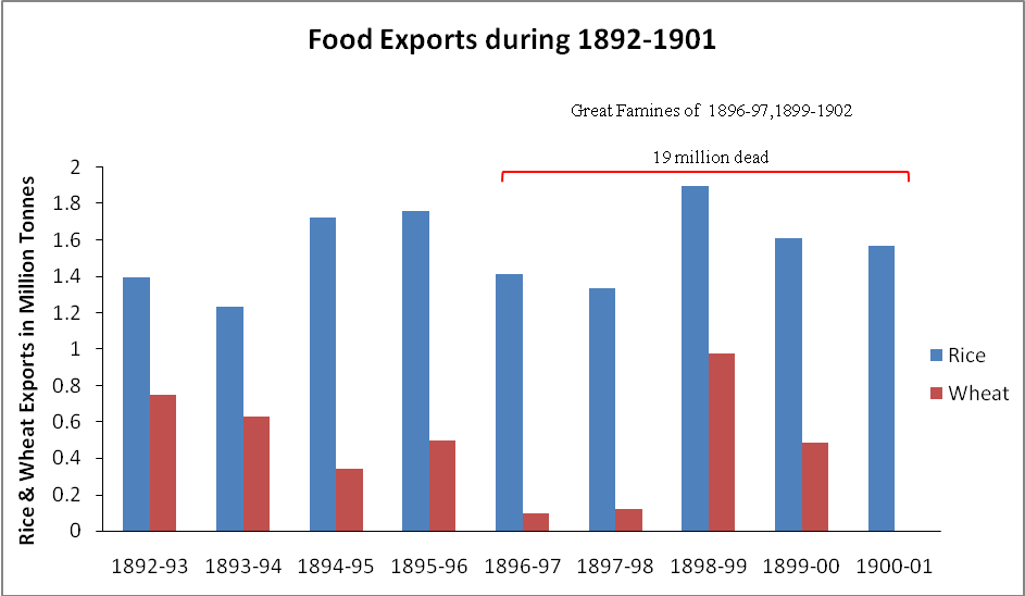 The same dismal story is repeated again in the terrible famines of 1896-1902.As can be seen from fig 3 above rice and wheat exports soared to record levels in the years where the famine was at its peak. The most conservative estimates of Indians who died in these two killer famines are 8.4 million while the more realistic estimate is about 19 million.
