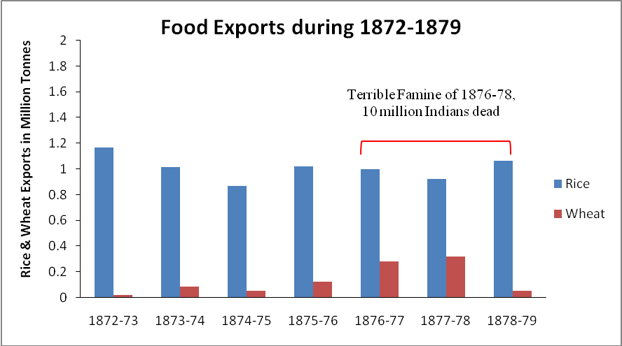 During the famine of 1876-79 CE rice and wheat exports continued more or less as usual. Close to a million tonnes of rice were exported each year while millions of Indians were dying of starvation. As can be seen from fig.1 in the peak famine year of 1877-78 a record three lakh tonnes of wheat were exported!!